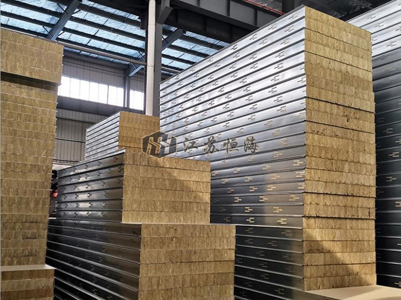 上/下鋼板可以用彩色鋼板、鍍鋅鋼板或不銹鋼板,厚度大約在0.3-1.0mm左右,芯材由(礦)巖棉構成,容重為80-140kg/m3,板材的有效寬度為950/1150mm,厚度為50-200mm。