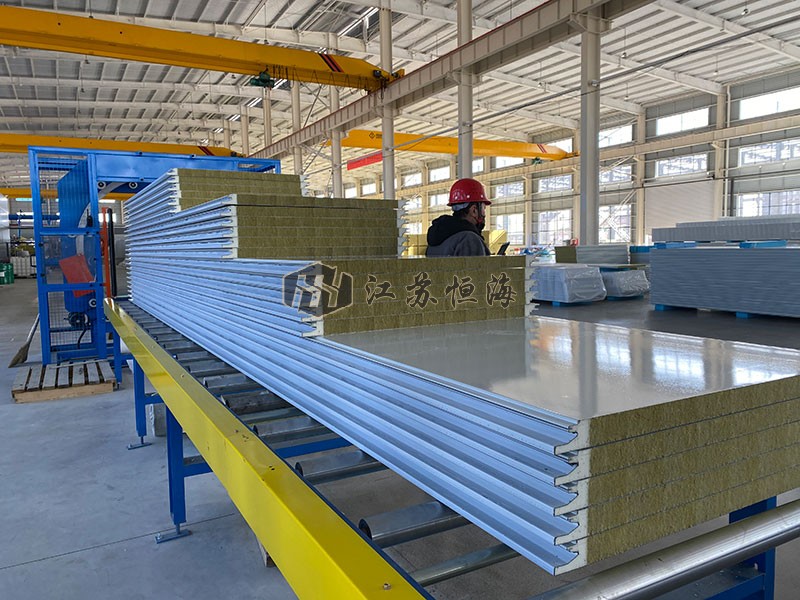 該板由高品質(zhì)彩涂鋼材連續(xù)冷彎成型,中間注入保溫阻燃型聚氨酯液體,經(jīng)高壓混合、發(fā)泡、固化等工藝加工后,芯材與面材強(qiáng)力復(fù)合而成。整套生產(chǎn)流程由聚氨酯連續(xù)自動(dòng)生產(chǎn)線在線完成。